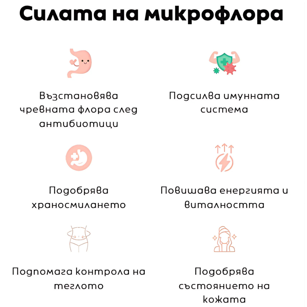 След 10-дневен курс антибиотици, стомахът ми беше съсипан. Постоянно подуване, диария и болки. Само 2 седмици с Микрофлора и отново се чувствам нормално! Мога да се храня без страх от последствия."